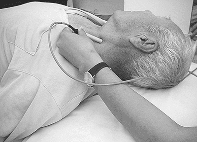 顱外頸動(dòng)脈的檢測部位位于頸部,均為皮膚及軟組織,因此正常情況下檢出率接近100%。探頭置于胸鎖乳突肌內(nèi)側(cè)緣或輕壓于胸鎖乳突肌上是檢測頸總動(dòng)脈(CCA)的部位,通??梢愿杏X到CCA明顯的搏動(dòng);探頭沿頸部向上移動(dòng)抵在下頜角下的部位(下頜下窗)(見下圖),此部位是檢測ICA顱外段(extracranial internal carotid artery,EICA)和頸外動(dòng)脈(ECA)的部位。探頭朝下置于鎖骨上窩,可獲得鎖骨下動(dòng)脈(SubA)和椎動(dòng)脈(VA)起始部的血流信號(hào),但由于走行變異較大,VA起始部的檢測往往較為困難,易造成漏診。此外,在耳屏后下方,即骨性標(biāo)志乳突下1cm左右還可以檢測到VA環(huán)樞段血流信號(hào)。