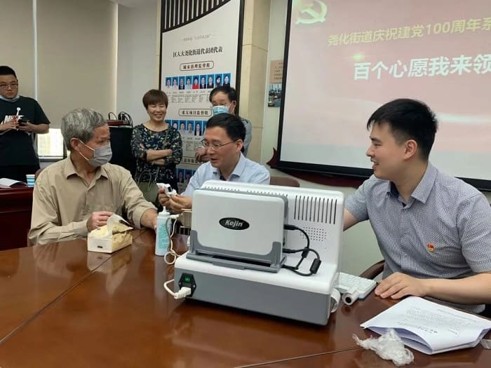 活動最后,公司領導親自用自主研發(fā)的超聲骨密度儀為五位老同志測量骨密度,并為老人耐心講解說明測量報告結果,給他們提出身體保養(yǎng)建議。