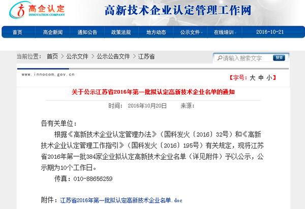 20161021日,江蘇省2016年度首批認定的高新技術(shù)企業(yè)名單公布(見附件309號),包括南京科進實業(yè)有限公司在內(nèi)的384家企業(yè)榜上有名。